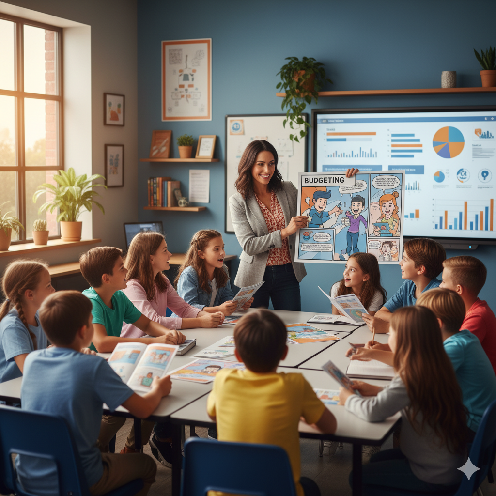 Middle school students (ages 11-13) can grasp more complex topics including budgeting, goal-setting, and basic investing principles. Comic narratives excel at showing long-term consequences of financial decisions. Students witness characters making budgeting mistakes and learning from failures, creating vicarious learning experiences that stick.